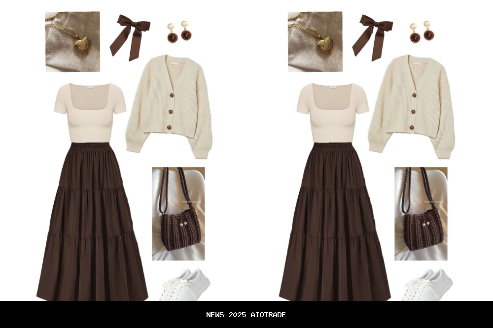 Outfit ini memadukan nuansa klasik dan vintage dengan sentuhan cozy. Cardigan krem oversized memberi kesan hangat, sementara rok maxi cokelat bertingkat menambah siluet flowy yang anggun. Cocok untuk acara Natal santai, jalan-jalan, atau kumpul keluarga. Sneakers putih dan aksesoris seperti pita rambut cokelat serta tas rajut menambah kesan manis dan vintage tanpa berlebihan.