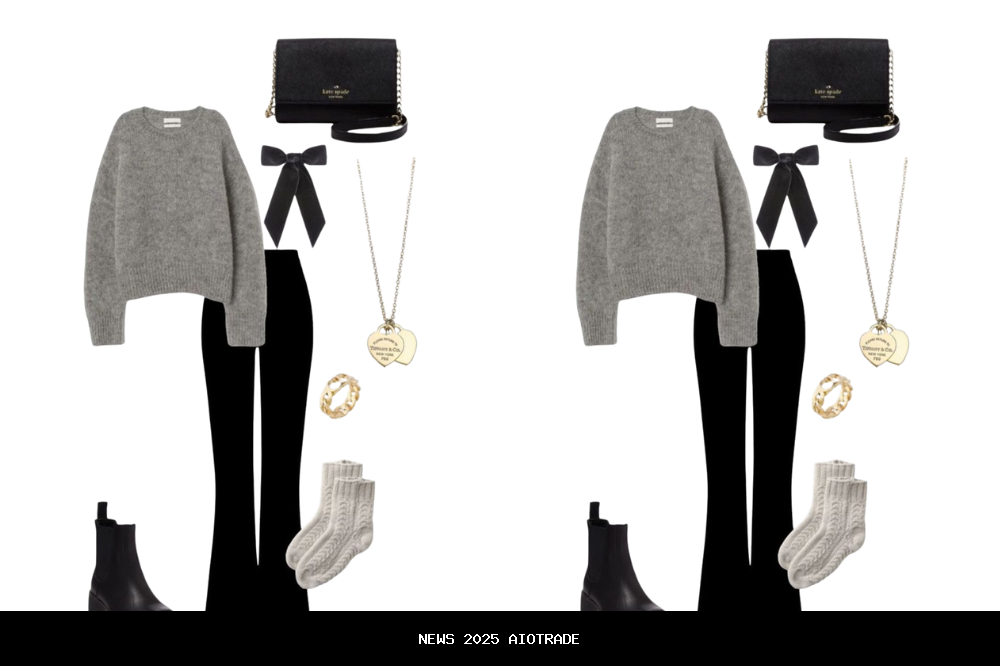 Tampilan ini memadukan sweater abu-abu oversized yang nyaman dengan celana hitam flare yang memberi sentuhan elegan namun santai. Aksesoris seperti pita hitam di leher dan tas crossbody menambah detail klasik, sementara sepatu boots hitam dengan sol chunky melengkapi look yang stylish dan hangat untuk Natal. Cocok dipakai untuk acara keluarga, jalan-jalan santai saat musim liburan, atau foto Natal dengan nuansa kasual namun tetap chic.