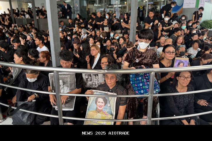 Para pelayat, beberapa di antaranya memegang potret mantan ratu Thailand, Sirikit, menunggu di Rumah Sakit Chulalongkorn untuk mengantarkan jenazahnya ke Istana Raja di Bangkok, Minggu (26/10/2025).