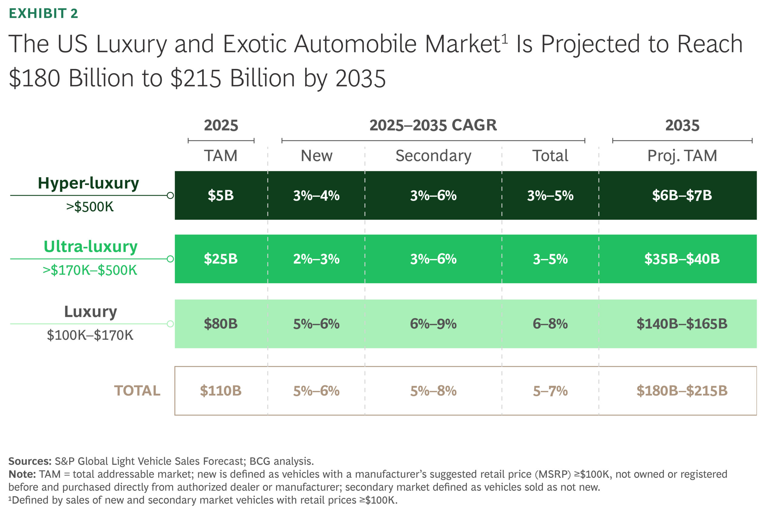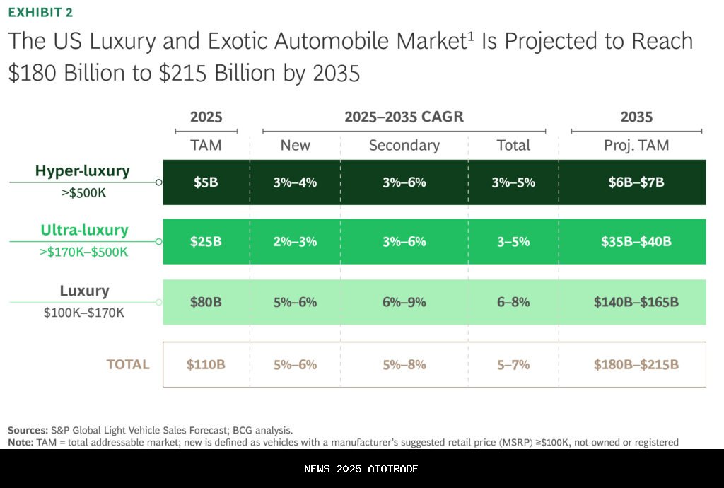 Kedalaman baru tentang dunia mobil mewah dan eksotis Amerika Serikat mengatakan pasar untukmahalmobil sudah bernilai sekitar 110 miliar dolar AS bisa meningkat menjadi antara 180 miliar hingga 215 miliar dolar AS pada tahun 2035, tergantung pada bagaimana tren permintaan dan persediaan berkembang.